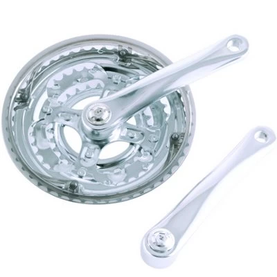 Ce pédalier en acier est compatible avec votre VTC 7/8 vitesses. Il est équipé d’une protection en plastique pour votre chaîne et de trois plateaux. Ses plateaux sont interchangeables en se fixant sur les quatre bras de plateau .Le petit plateau est de 28 dents, le plateau intermédiaire de 38 dents et le grand plateau de 48 dents, vous bénéficiez ainsi d’une grande amplitude pour votre changement de vitesses. Ces dentures sont souvent montées sur les VTC.
