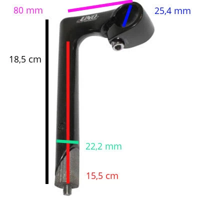 En aluminium, cette potence vélo de couleur noir mesure 80 mm de long. Elle pèse 344 g. Il s’agit d’une potence plongeur qui convient pour la pratique du vélo de route, ville et fixie. Elle possède une inclinaison d’environ 15°. Elle s’insère ainsi dans le tube de direction de diamètre interne 22,2 mm ou de 25,4 mm via un adaptateur pour tube de direction, proposé en option.