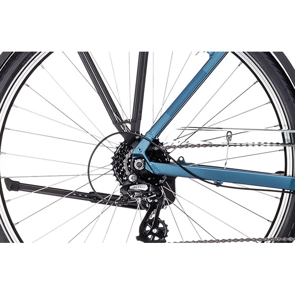 Il combine un cadre aluminium à géométrie trapez et un équipement fiable et efficace. Il reçoit ainsi une transmission Shimano Altus 3×8 vitesses permettant de passer partout avec sérénité, des freins V-brake efficaces, ou encore une fourche suspendue SR Suntour absorbant les vibrations etamortissant les chocs.
