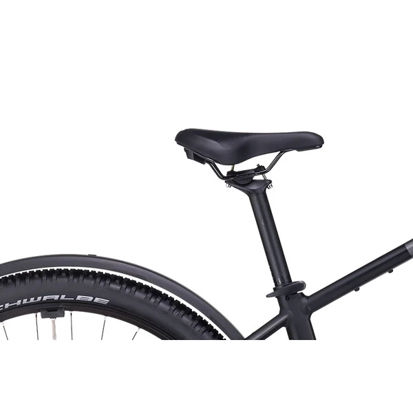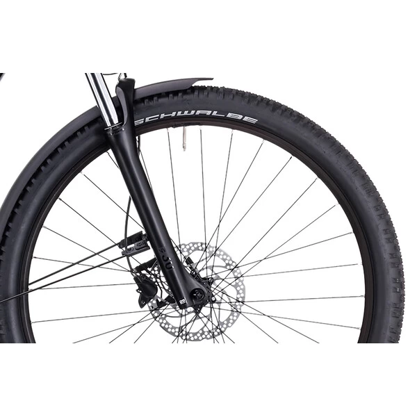 Ses pneus Schwalbe, robustes et adhérents, s’associent à la fourche suspendue Suntour pour vous offrir une traction et un pilotage sécurisés, fiables et confortables quelles que soient les conditions. Sa transmission Shimano 9 vitesses procure une vitesse adaptée à tous types de profil, tandis que ses freins à disque hydrauliques Shimano MT200 possèdent toute la puissance nécessaire pour un freinage efficace.