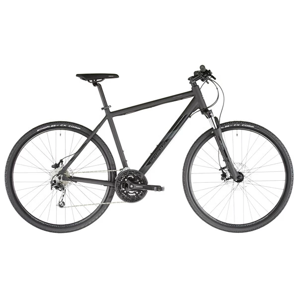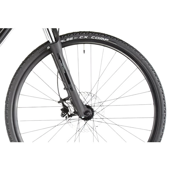 Un vélo robuste et armé pour les terrains difficiles, à l’image des jantes aluminium à double paroi et des pneus Schwalbe CX Comp de 40 mm.